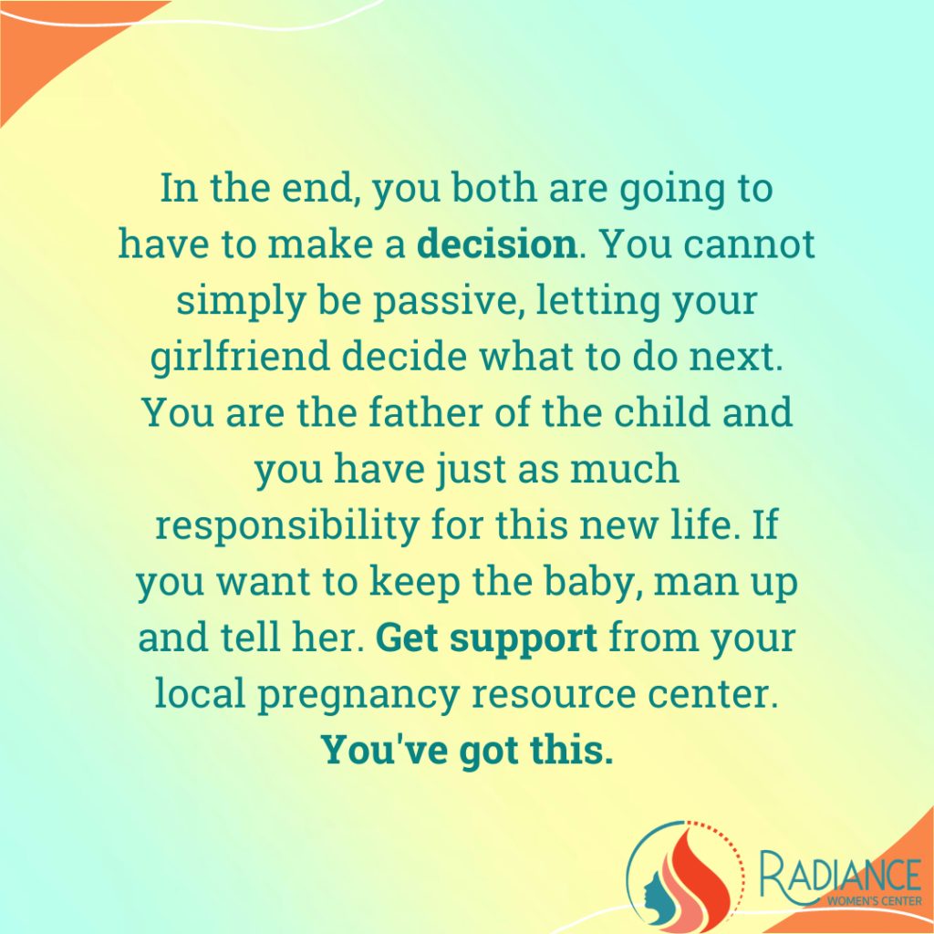 If your reasons for not keeping the baby are financial, it’s a good idea to consider alternate resources. It’s no secret that children are expensive, but there are many programs that exist to help (2). Visiting a pregnancy center will help you find these resources. “Pregnancy Resource Centers offer counseling, medical services and may be able to help you secure local financial resources in your community” (3). These community resources can help support you through your girlfriend’s early pregnancy and beyond. Pregnancy centers are also completely confidential and do not require insurance.